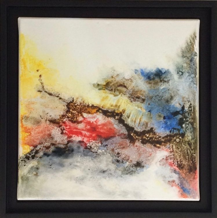 Une trentaine d'artistes présentent leurs travaux réalisés sur des formats de toiles 20 x 20 encadrées de noir.